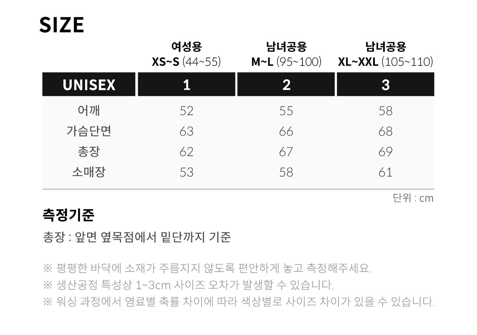 3 (XL~XXL, 남녀공용 105~110) 어깨 58 가슴단면 68 총장 69 소매장 61