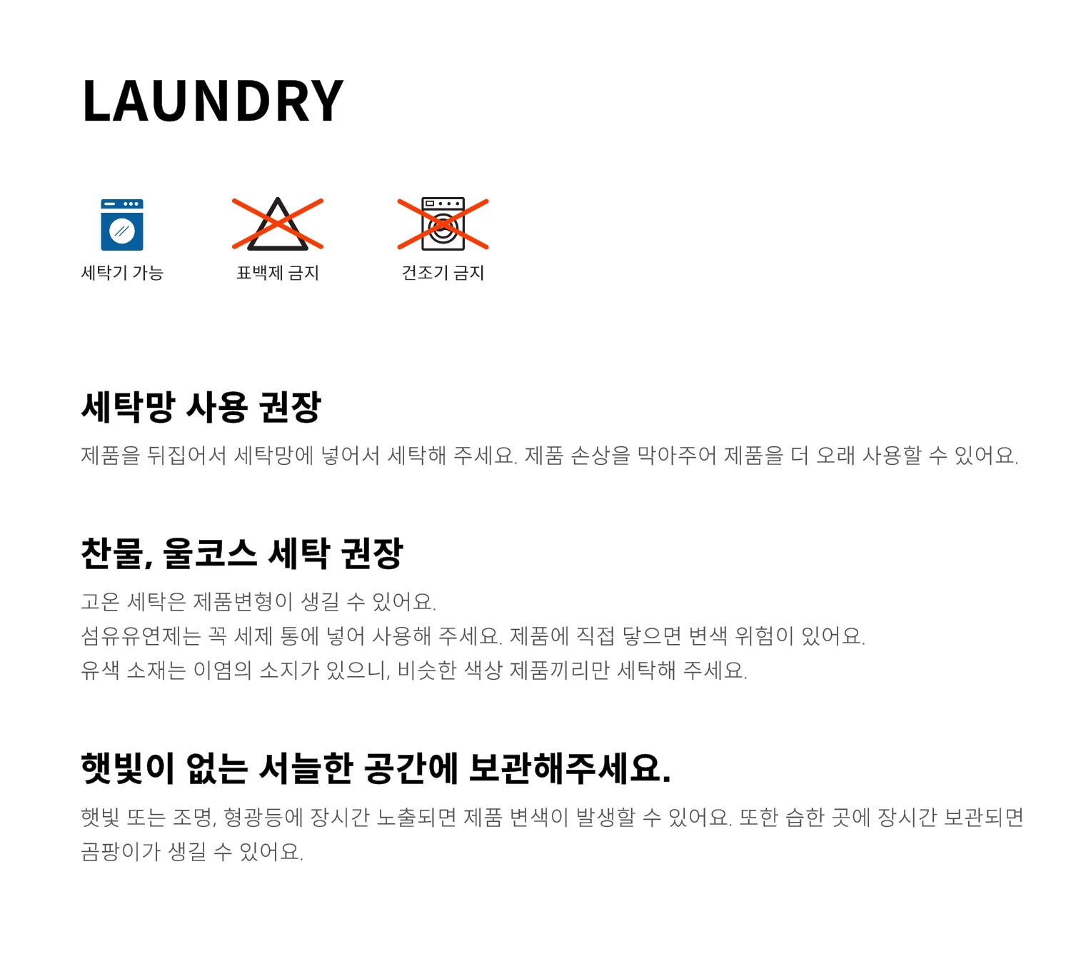 세탁방법 및 취급시 주의사항