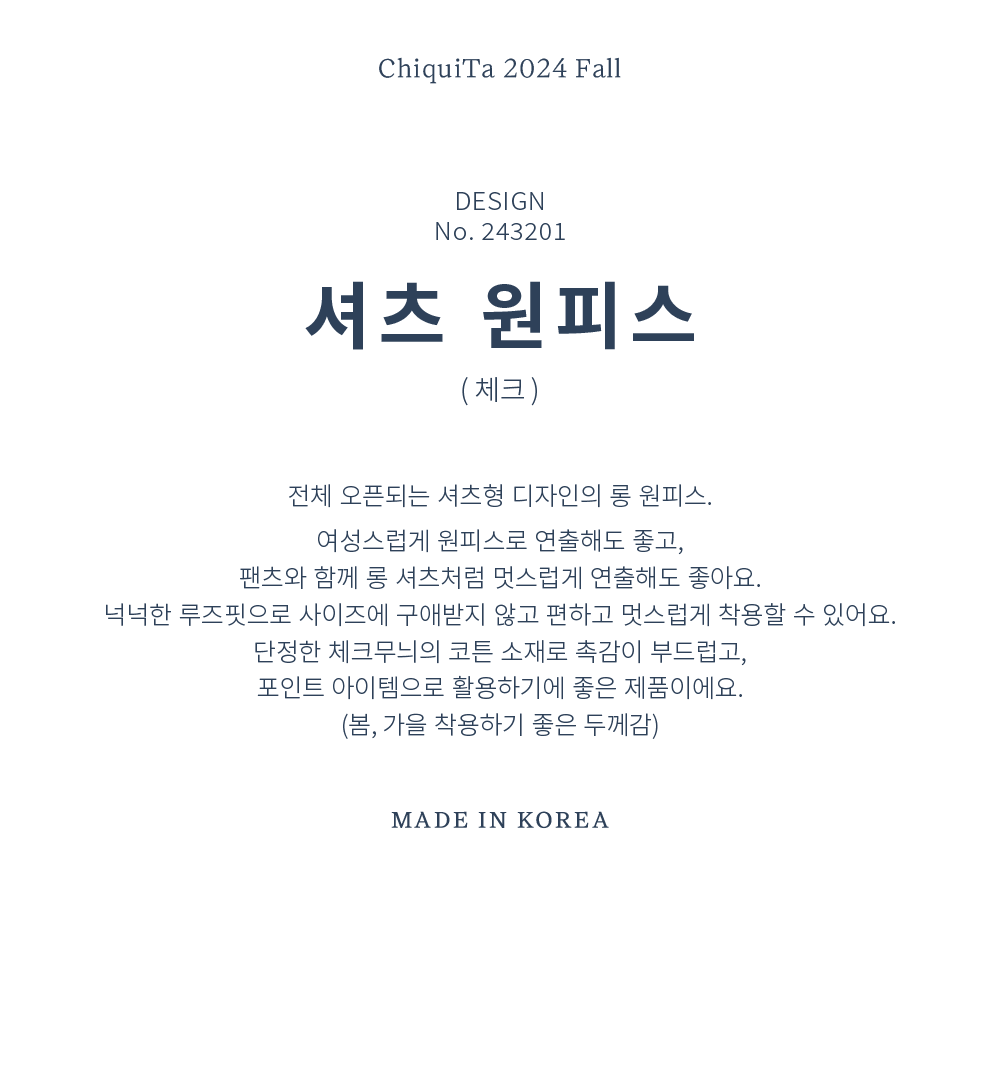 여성스럽게 원피스로 연출해도 좋고, 팬츠와 함께 롱 셔츠처럼 멋스럽게 연출해도 좋아요.