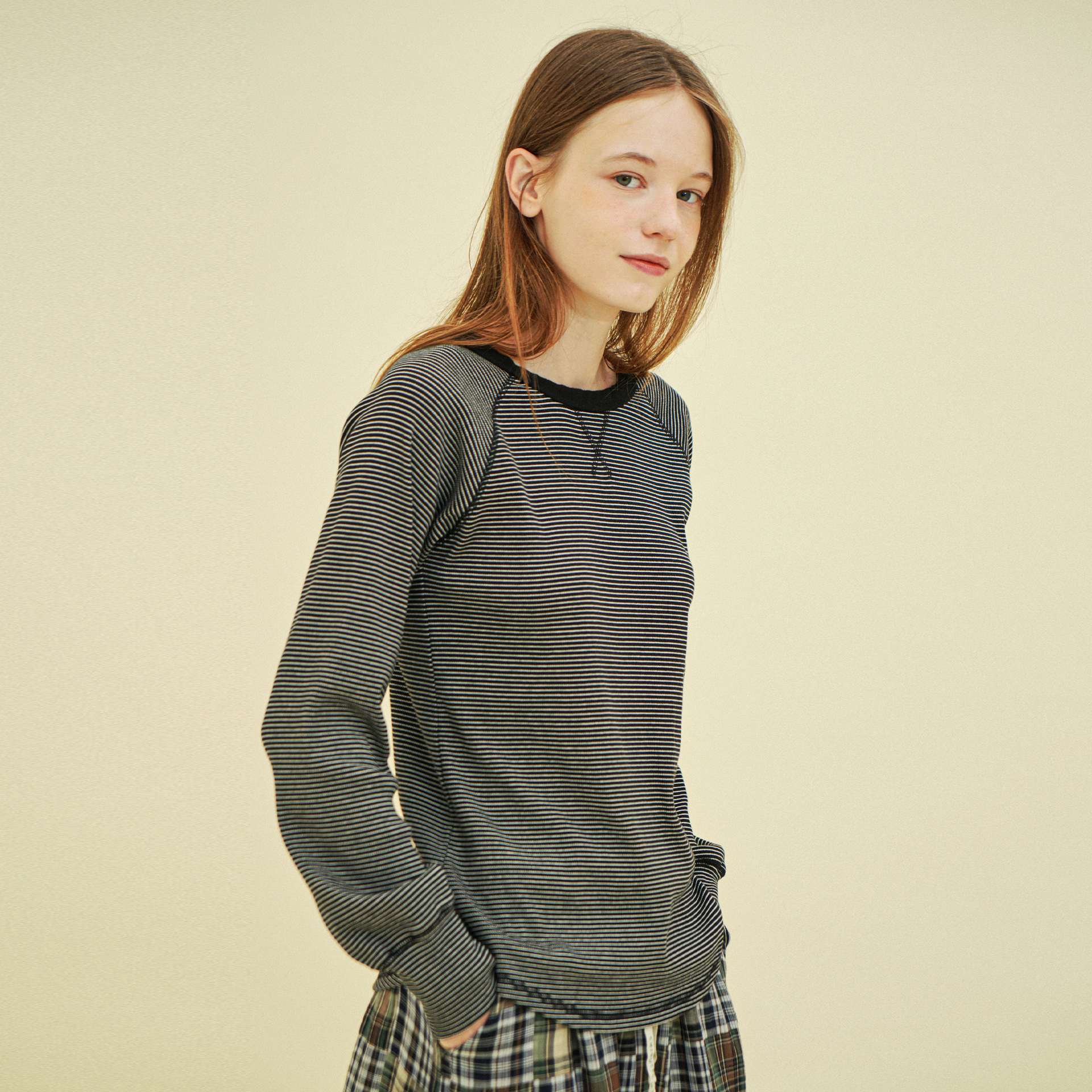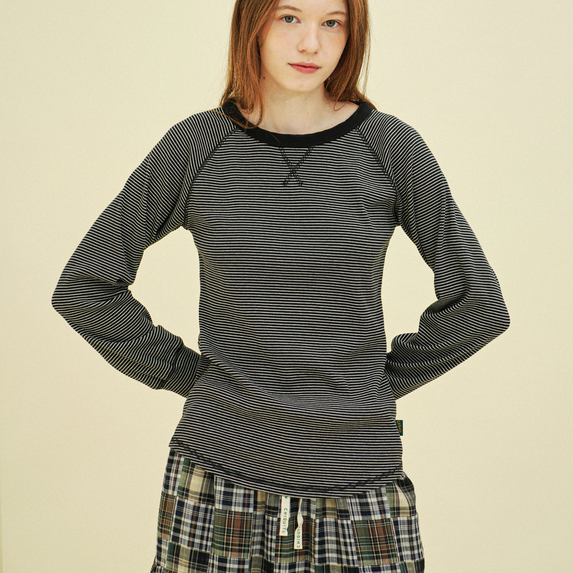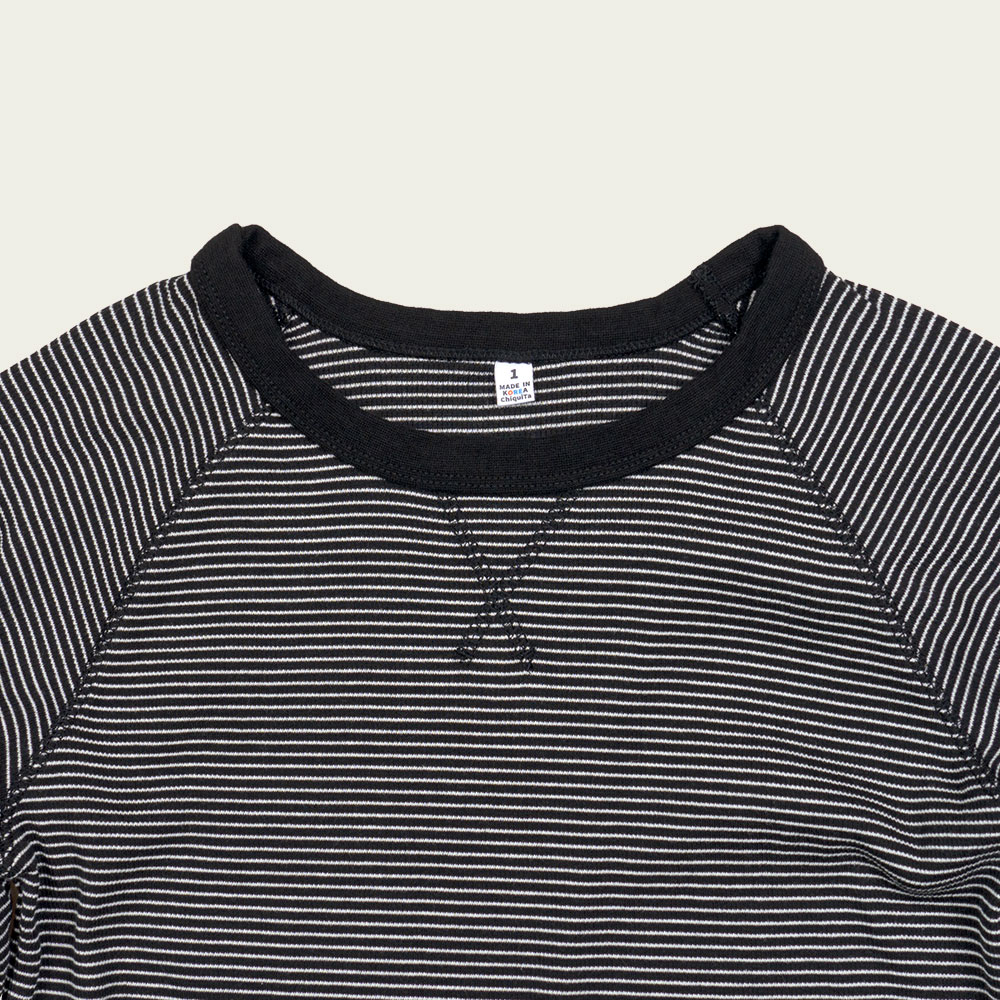 코튼 골지 스트라이프 래글런 긴소매 티 블랙