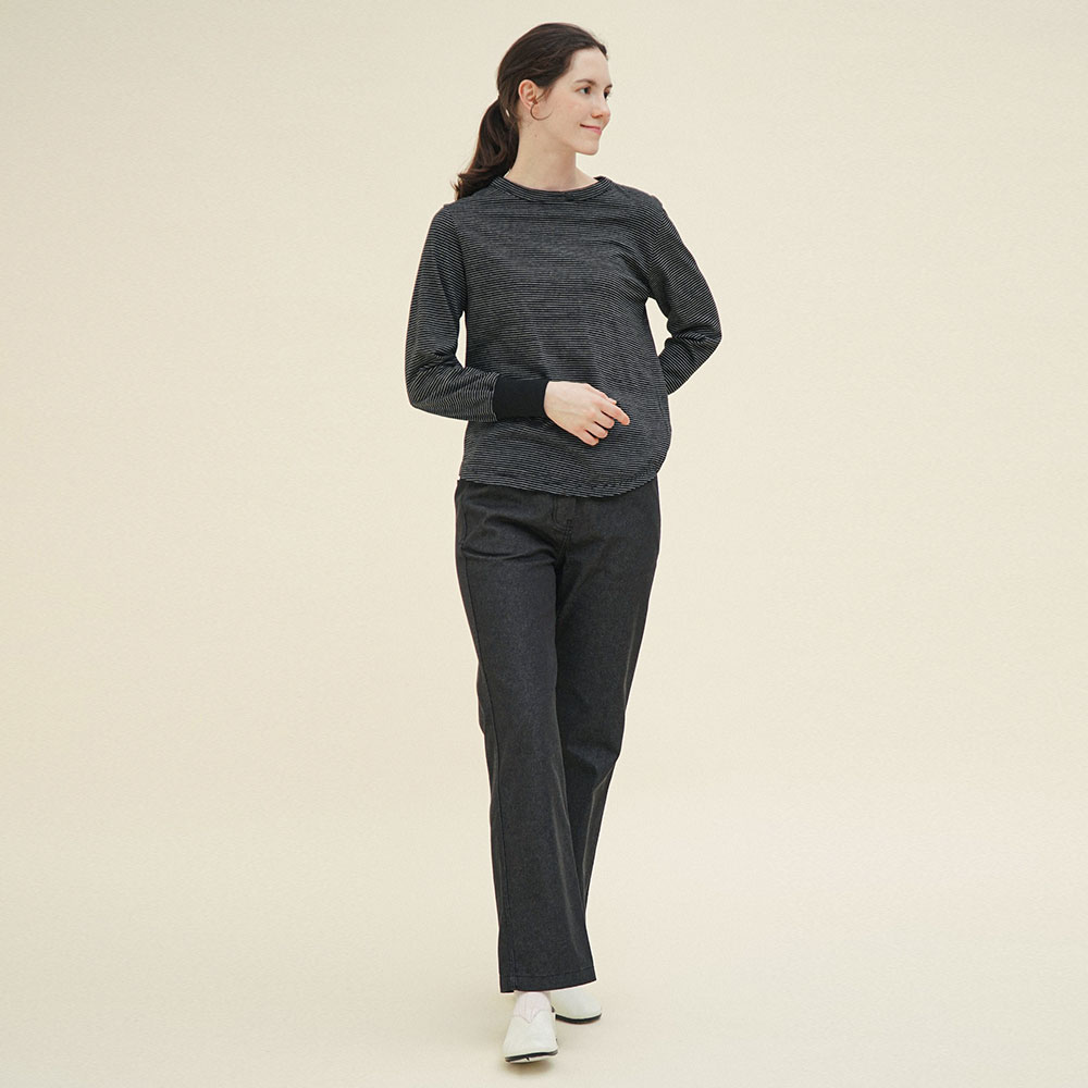 다리는 여유 있는 스트레이트 핏으로 자연스럽게 떨어져 다리가 곧고 길어 보입니다.