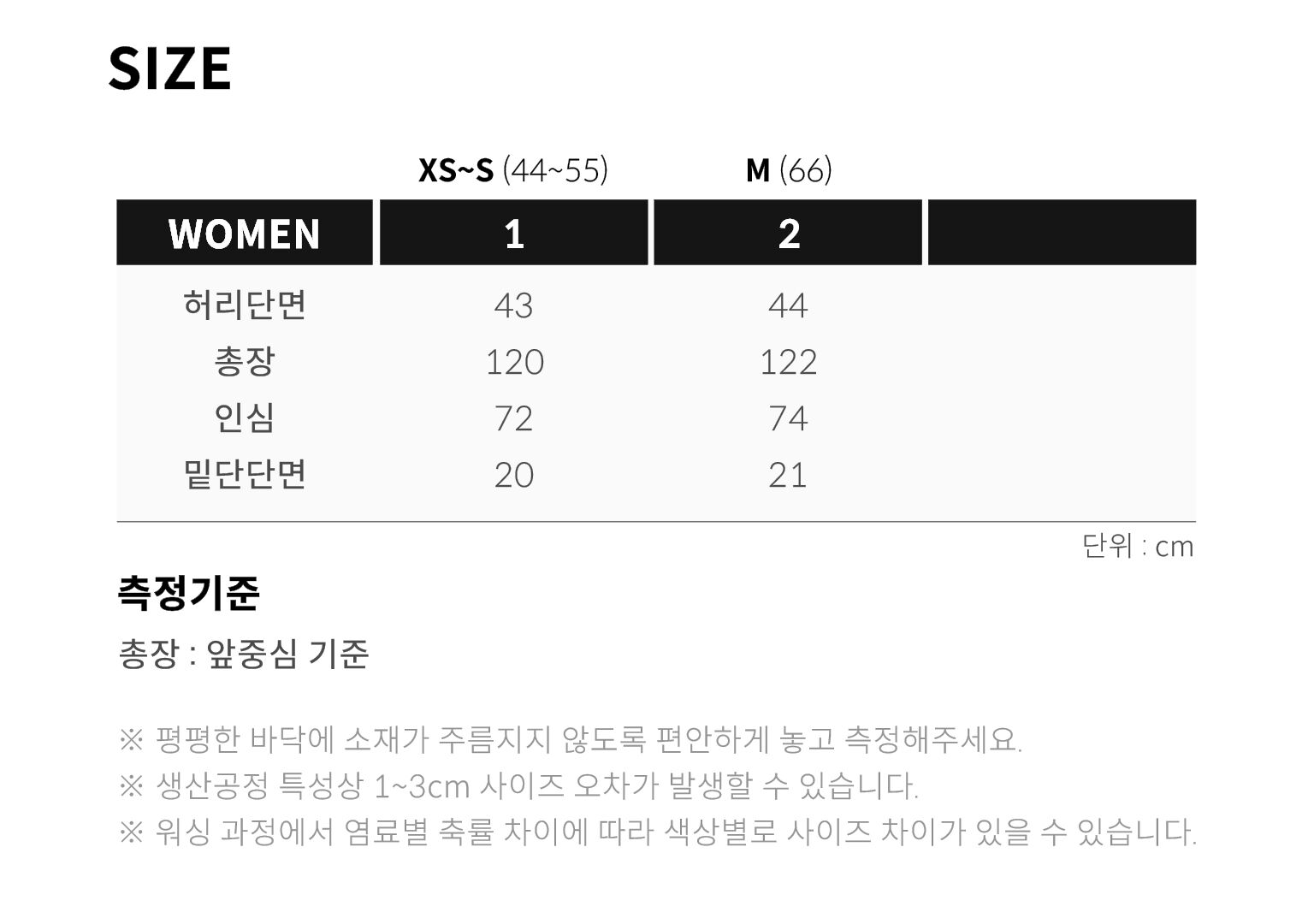 1 (XS~S, 44~55) 허리단면 43 총장 120 인심 72 밑단단면 20