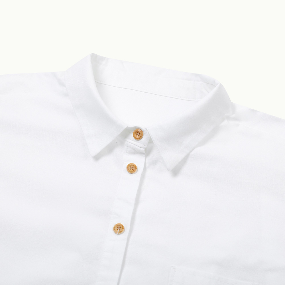 옥스포드 소재와 우드 버튼이 내추럴하게 어우러지며, 가슴 포켓과 함께 스커트 양옆 포켓을 더해 실용성을 높였습니다.