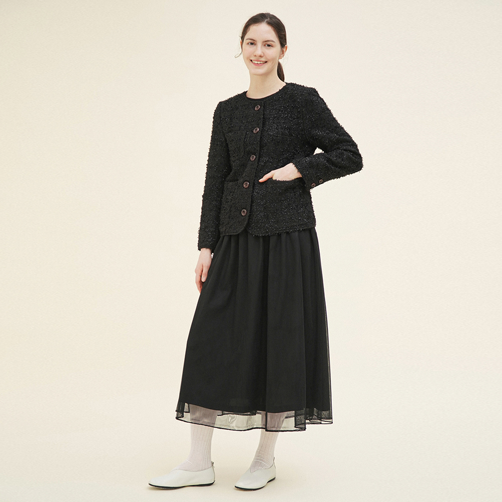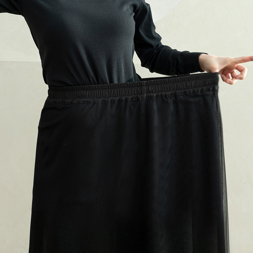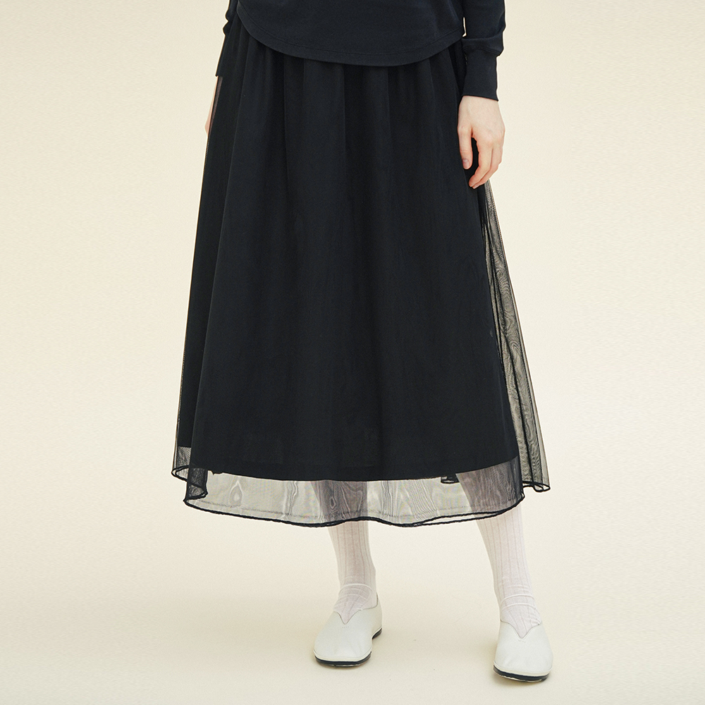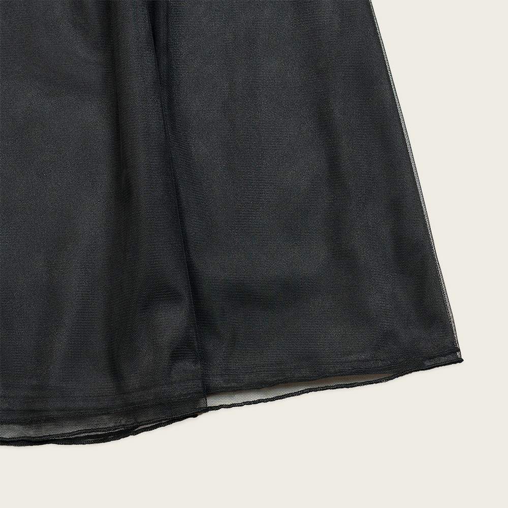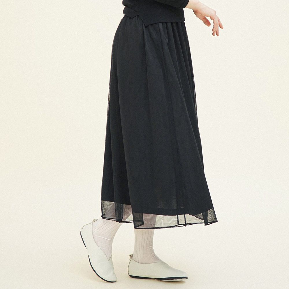부드러운 망사 소재와 은은한 무게감의 공단 안감을 사용해 자연스럽게 떨어지는 실루엣이 매력적인 스커트입니다.